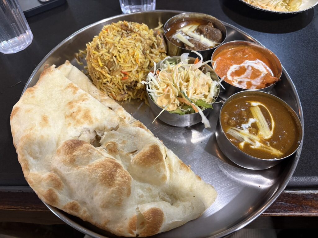 パキスタン料理初心者の2人はカレー3種(チキン・マトン・チキンバター)、チキンビリヤニ、ナンがついたセットを注文。
